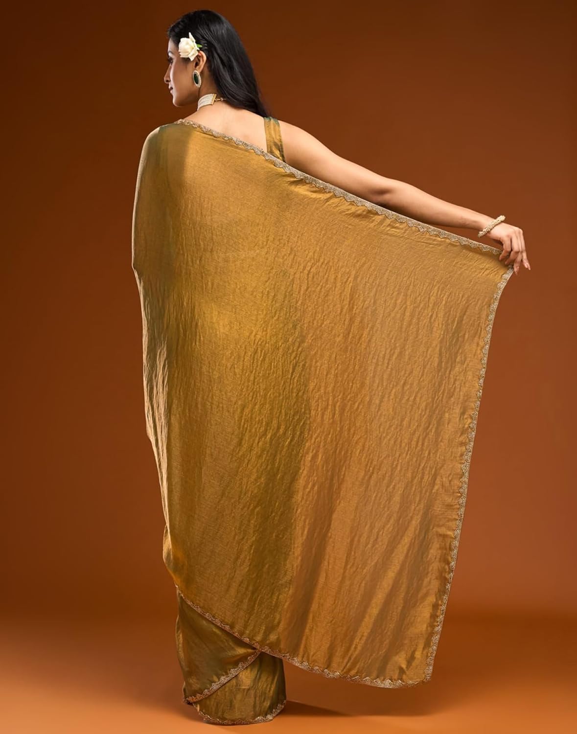 Glow like royalty in this stunning Golden Shimmer Chiffon Saree — a perfect blend of tradition and contemporary style! 💛